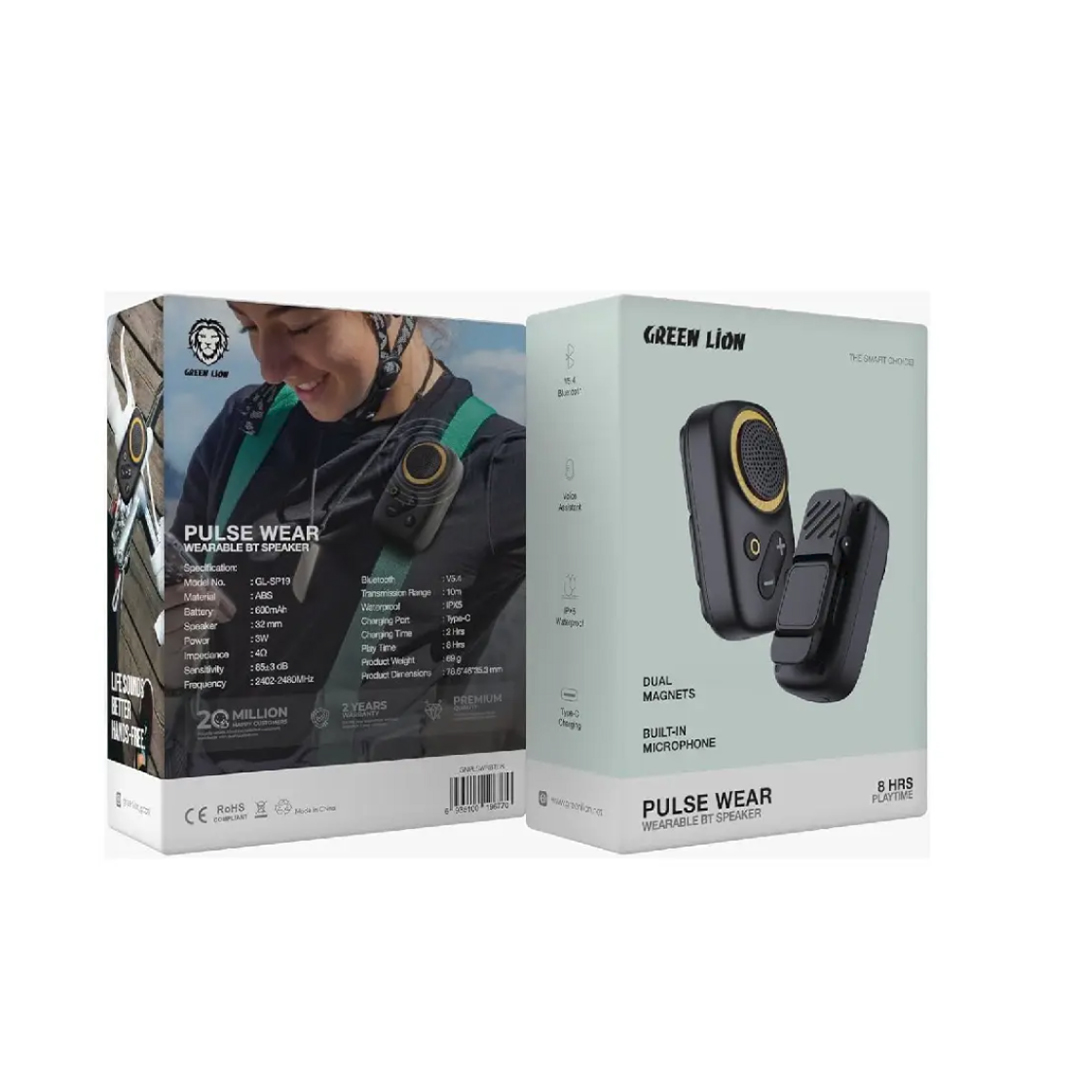 بدنهی مقاوم از جنس ABS با طراحی جمعوجور و کاربردی برای استفادهی روزمره و در حرکت میکروفون داخلی برای مکالمه و بازهی فرکانسی ۲۴۰۲ تا ۲۴۸۰ مگاهرتز برای کیفیت پایدار صدا اسپیکر بلوتوثی گرین لاین مدل Pulse Wear Wearable .