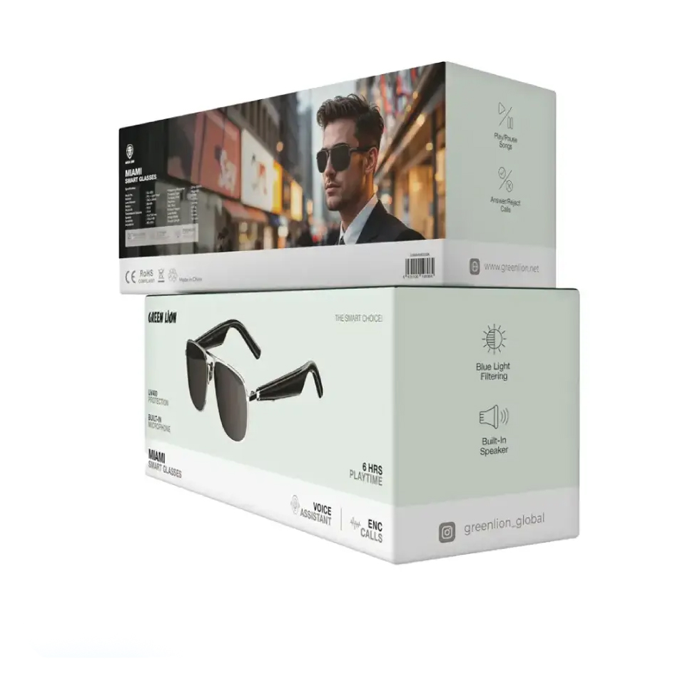 محصول با کیفیت دیگر از برند نام آشنای گرین لاین که دارای امکانات و زیبایی قابل توجهی میباشد و عینک هوشمند گرین لاین مدل Miami Smart Glasses  دارای امکاناتی مثل: عکس فوری آسان، صدای با کیفیت، پاسخ/رد تماس‌ها، محافظت در برابر اشعه ماوراء بنفش ۴۰۰، میکروفون داخلی، دستیار صوتی، تماس‌های ENC، پاسخ فرکانسی: 20 هرتز – 20 کیلوهرتز، بلندگو: ۱۵.۴ × ۳.۸ میلی‌متر، امپدانس ۸ اهم ± ۱۵٪ شارژ مغناطیسی میکروفون اسپیکر